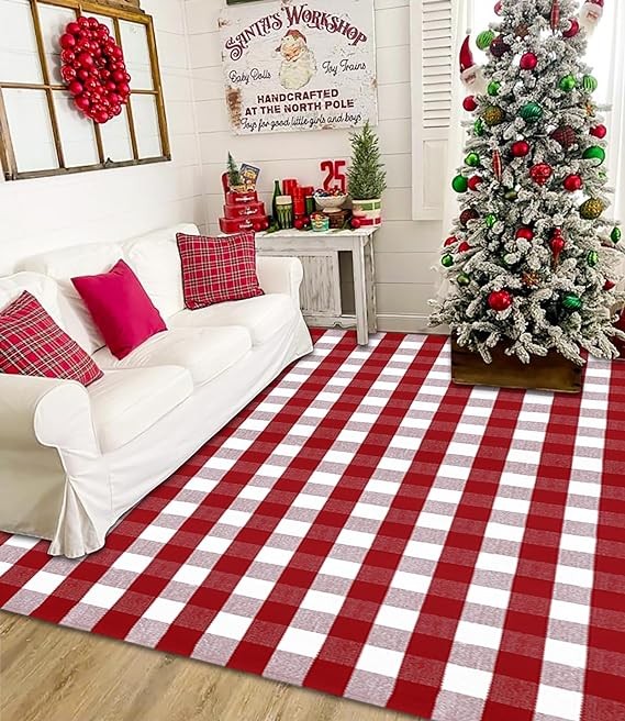 • ? Xmas Rug: Soft cotton, red/white checkered with vibrant Christmas colors. Modern yet timeless, perfect for holiday decor. Elevate your festive ambiance!