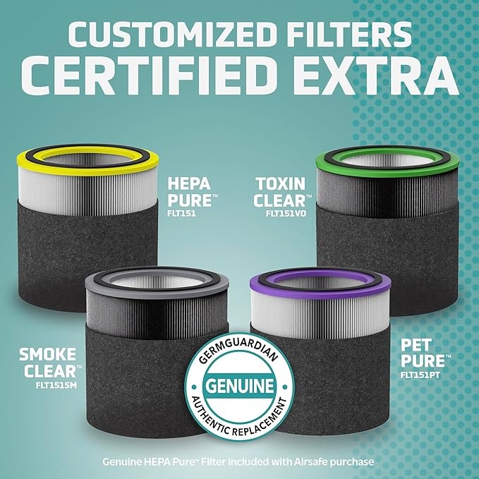 • ✅【GENUINE GERM GUARDIAN FILTERS】 Search for B0BXQHD518 or FLT151 HEPA Filter V. Genuine Germ Guardian replacement filters for certified fit and maximum filtration. Off-brand filters often fail HEPA testing standards, fit incorrectly, reduce efficacy, and may cause damage to the air purifier.