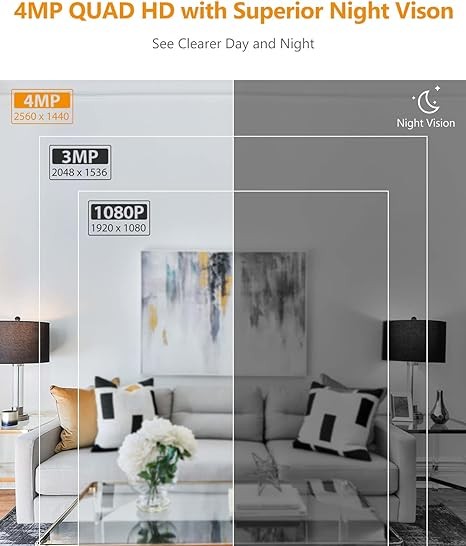 • SEE EVERYTHING CLEARER DAY AND NIGHT: (2560×1440) 4MP Quad HD live monitoring with 33 ft superior night vision provides highly detailed clarity, even in complete darkness. 0-355° horizontal and 0-90° vertical rotation enables a complete 360-degree view