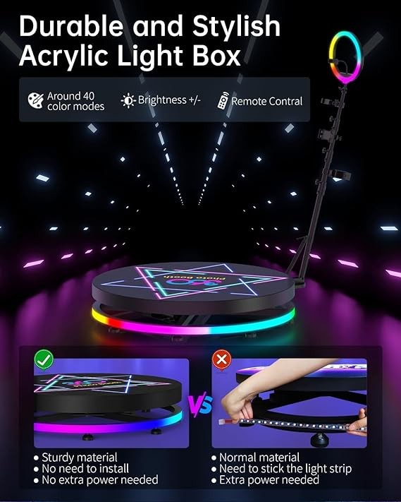 • [Quality Assurance and 5-year warranty] Promise a 5-year warranty on our 360 photo booths. Years of experience in the industry give us the confidence to say that if you have any questions, we will help you solve it or even send you a new one. NOTE: the RGB Ring Light needs to be powered by a power bank which is not included in the package due to shipping restrictions, please contact us to get a free one if you need it.