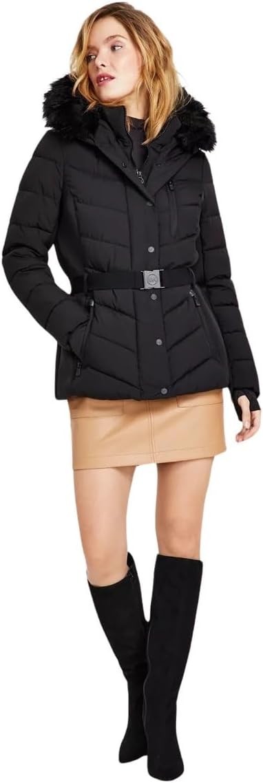 Michael Michael Kors Women's Faux Fur Hooded Puffer Scuba Belted Coat Jacket Black