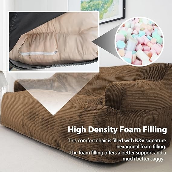 High Density Foam Filling: This comfort chair is filled with N&V signature hexagonal foam filling. This filling is freshly made from high quality high density foam. The foam filling offers a better support and a much better saggy resistance compare to traditional bean filling. In addition, the foam won’t make the unpleasant squeak that the traditional bean filling does.