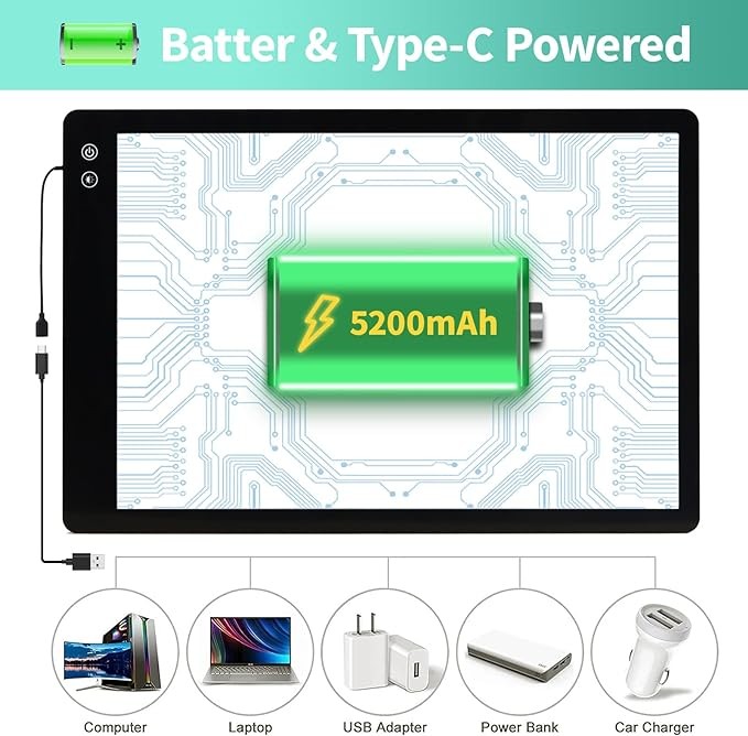 • Rechargeable Light Pad: A2 light pad is available with both built-in battery power and USB power supply, with a built-in 5200mAh battery for use in places without a power supply. Equipped with C-port for easy charging, works for approx 3 hours at MAX brightness after fully charged(Fully charged in 4 hours)