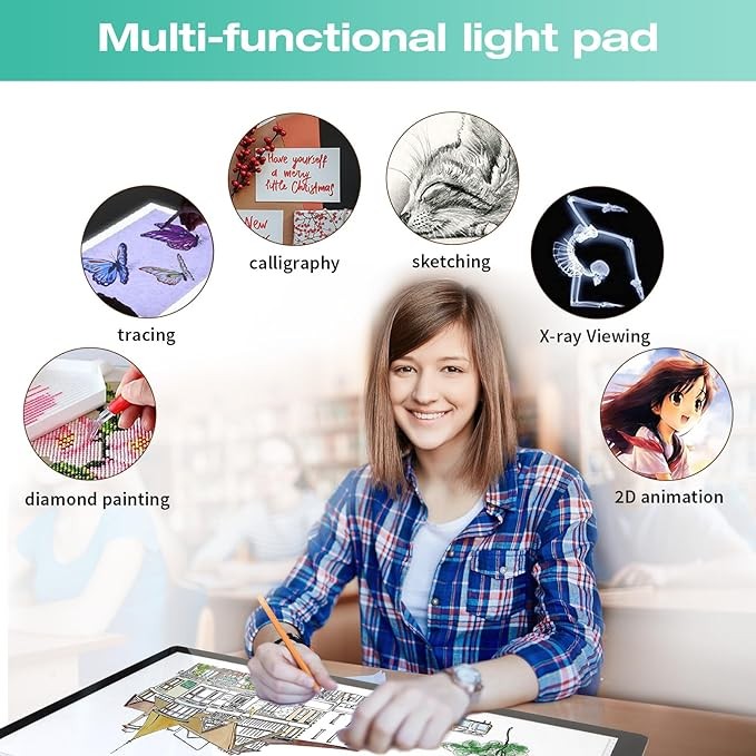 • Tracing Light Pad Usage Scenarios: Drawing light box can be used for diamond painting, weeding vinyl, 2D animation, calligraphy, scrapbooking, tattoo transfer, sketching and painting, streaming, sewing projects, stained glass, quilting and more. It is not only the perfect tool to assist in improving painting skills, but also an ideal gift for children's day, father's day, birthdays, etc.