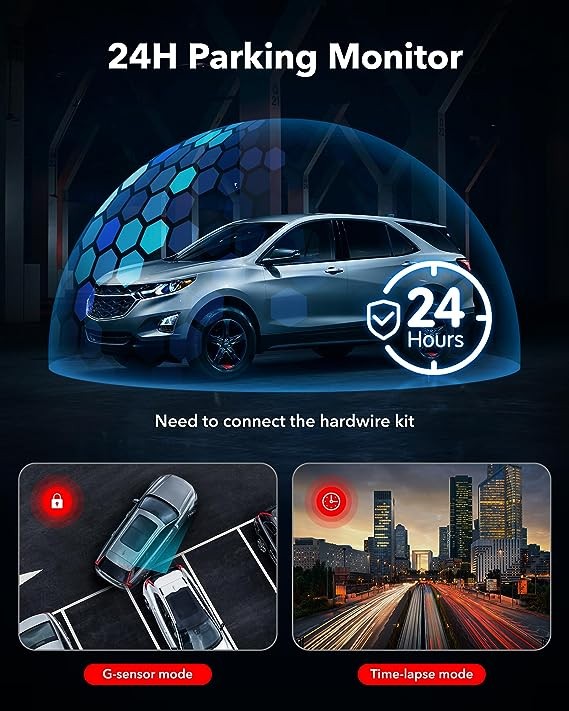 Reliable Accident Recording Function - Even if the SD card is full, the dash cam will continue to record with its loop recording function. Once the G-sensor detects a sudden collision, it locks and saves the collision video. There is also a 24-hour parking monitor on the driving recorder, which can continuously record for 24 hours in parking mode. Please note that a hardware kit is required.