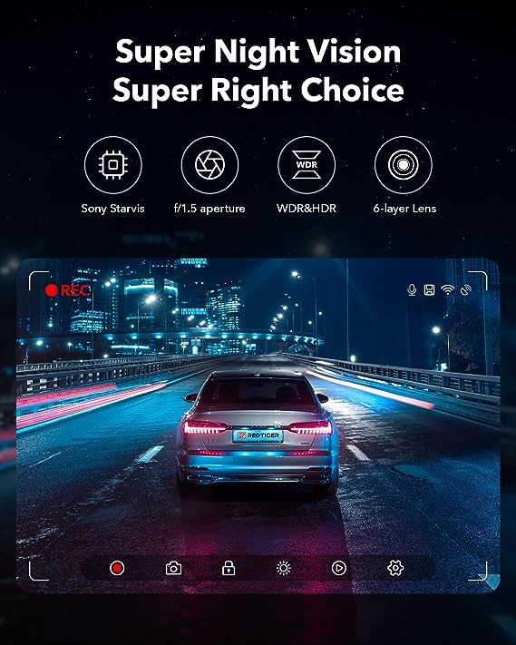 Excellent Night Vision - The dash cam adopts an extra-large F1.5 aperture and 6-layer optical lens, and is equipped with HDR/WDR technology to clearly capture important details in low-light conditions.