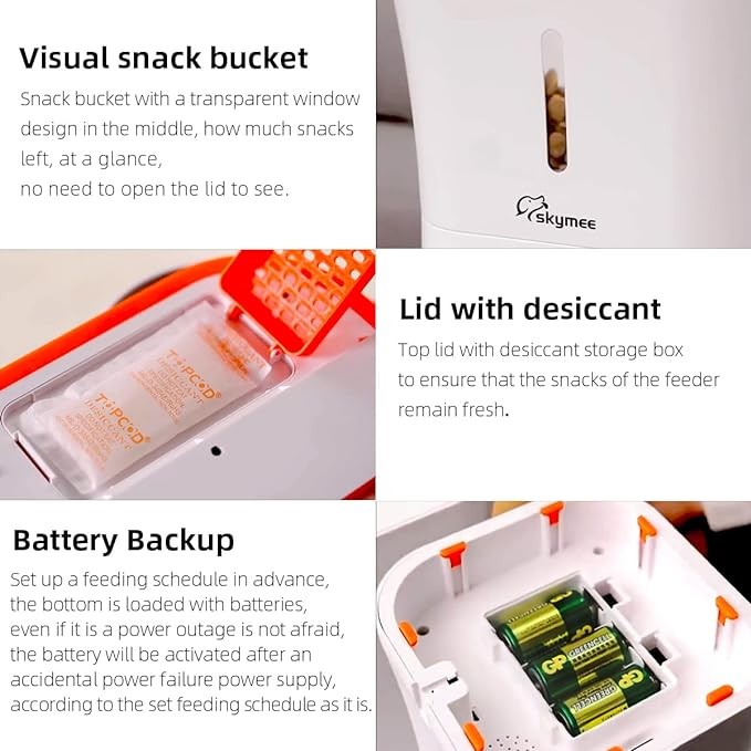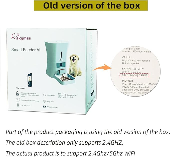 MORE -- Skymee will alert you when it detects dog movements or food running low. Dual power supply system with external USB cable and 3 pieces D batteries (not included) to prevent power off. Please pay attention that skymee pet feeder can connect 2.4G WiFi and 5G WiFi.