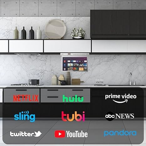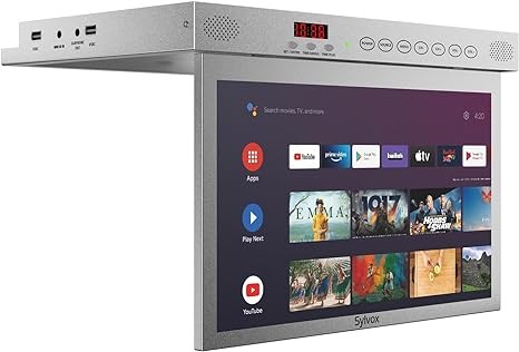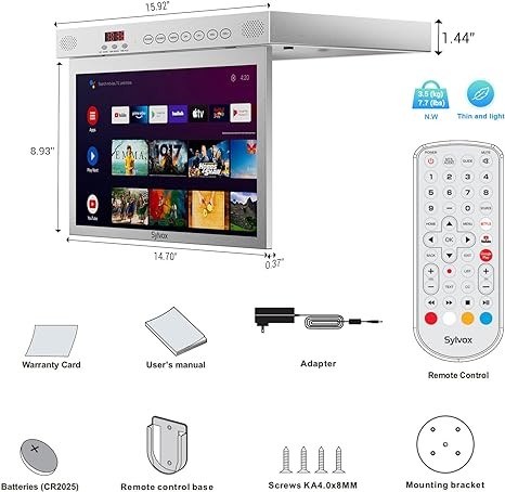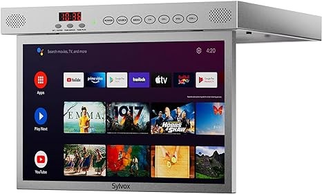 SYLVOX 15.6" Flip Down Smart TV Under Cabinet Kitchen TV Android 11.0 Supports 360 Degree Rotation WiFi & Wireless Connection, Storage Design for Kitchen Bedroom RV Yacht (Silver),Black