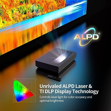 • 【4K UHD Laser Projector】 Superior Resolution might be an understatement. With 4K UHD, you get 4x resolution of full HD or 1080p. Nova is built with industry-leading patented ALPD 3.0 and TI DLP technology. ALPD allows for light to be used more efficiently for finer detail across a wider color gamut and deeper vibrance for breathtaking video resolution. 1300 ANSI Lumens Short throw projector reduces eyestrain by diffusing light without losing picture quality
