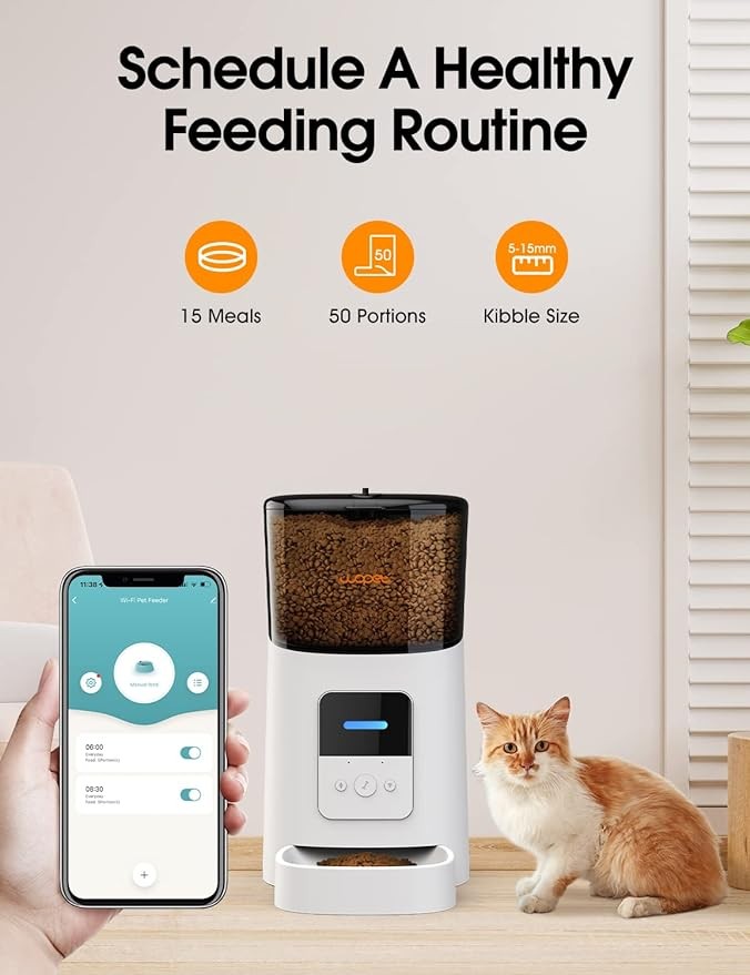 • SMARTPHONE PROGRAMMING: Control your pet's meal time from anywhere using your smartphone; Program up to 15 meals to feed on your pet's schedule; 1-50 portions per meals, about 5g per portions, Allows you to feed your cat or dog outside of normal feeding times, Help control body weight and establish good eating habits which will allow them to live a long and healthy life with you.