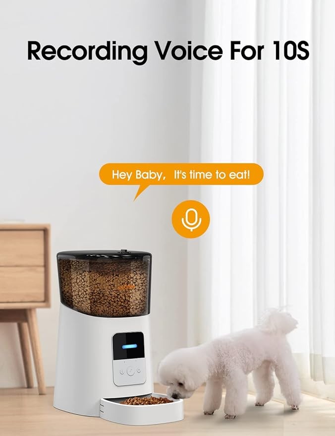 • RECORD A CUSTOM MESSAGE FOR YOUR PET: Keep your pet excited about meal times! Press and hold the record button to begin recording a voice message to be played as each feeding dispenses. Otherwise, everytime you're away from home while you want to comfort your pet and let him know you're with him, you can set a timing feeding closest the present time and when food dipensed, he can hear your voice recording and doesn't feel lonely.(e.g. Here, Fido! Come and eat, boy! Good doggy.)